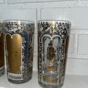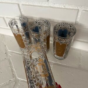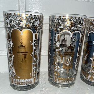 Absolutely gorgeous and in amazing preowned vintage condition! Add a touch of vintage charm to your drinkware collection with these four mid-century modern glasses. The round glasses feature a beautiful botanic garden pattern with 22 kt gold accents and a glossy finish. Each glass stands at a height of 5 1/4 inches. Highball