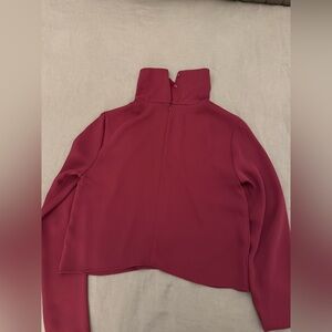 Satin effect blouse with long sleeves and high neck that can be worn buttoned up or down. Slightly cropped for a boxy and flowy fit. Wine colored.