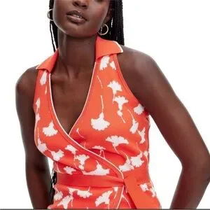 Step out in bold, timeless style wearing this Collared Sleeveless Ginkgo Wrap Dress from Diane von Furstenberg. Made from a soft jacquard fabric blend, this sleeveless midi-length wrap dress features an allover ginkgo cherry tomato pattern. Designed with a polo collar, a racerback and a tie belt at the waist, the look is inspired by the iconic DVF wrap dress.