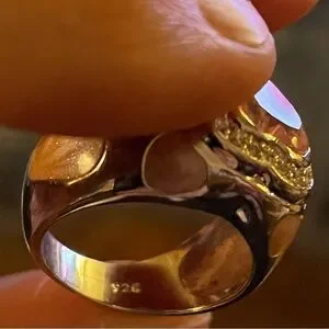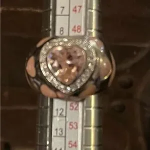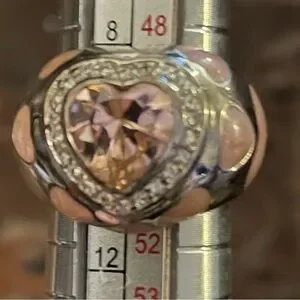 Sterling silver, stamped .925. Pink enameled hearts and a faceted pink heart shaped stone surrounded with tiny gold color clear stones.