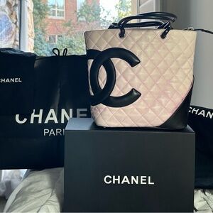 🥳CHANEL CAMBON Pink w/ black monogram Tote, Calfskin.