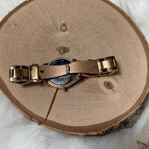 Fossil Stella Glitz Rose-Gold watch. Stainless steel case and bracelet. Fixed rose gold-tone bezel set with crystals. Rose dial with rose gold-tone hands and index hour markers. Minute markers around outer rim. Analog. Sub-dials featuring date, day of the week, and 24 hours. Quartz movement. Pull/push crown. Solid case back. Case diameter: 37mm. Band width: 18mm. Deployment clasp with push button release. Water resistant at 50 meters/165 feet. Minimal scratching due to normal use. All crystals intact. Needs battery. EUC.