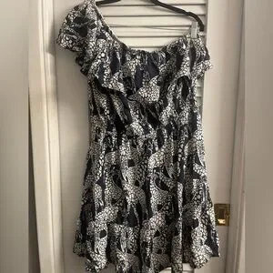 Crown & Ivy 1 Shoulder Asymetrical Ruffled Neckline Smocked Abstract Animal Print Dress Size M Medium