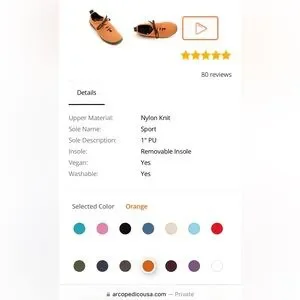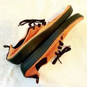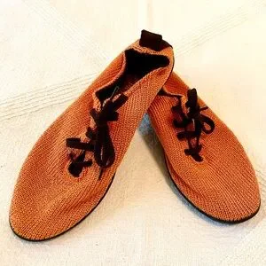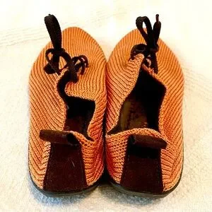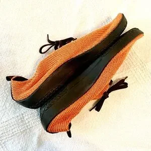 Arcopedico brand LS style slip-on laced comfortable sneakers in orange silky knit, super comfortable & supportive; feel like you are wearing socks but with lightweight eco-friendly travel-friendly shoes. See other color which may also be available. Made in Portugal. Great condition. See photos for visual description, condition, & details. First few pictures of the actual item, last pictures are screenshots from the company website for product info.