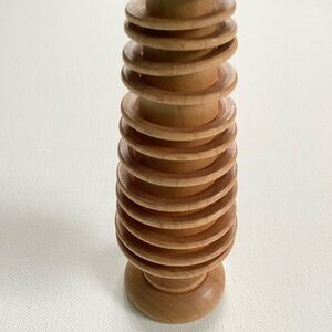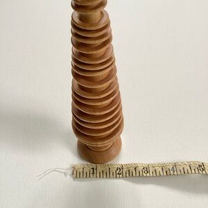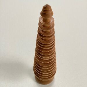 Wood tree decor, made up of rings on a conical base. Measures approximately 8” tall by 2” at the widest part. Any questions, I’m happy to help!