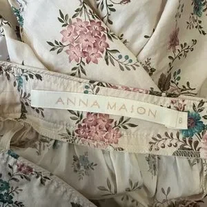 This is an Anna Mason maxi skirt in size 6, made of cotton in an orange color with a floral pattern. The skirt features a tiered and layered design with a flare silhouette, accented with a zipper and pockets. It is suitable for travel and casual occasions, and has a beach, bohemian, 90s, fairy, and preppy theme, making it perfect for summer and spring seasons.