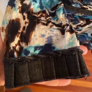 Top with open front detailing ( tank top needs to e worn) has jean material details on shou and cuffs and hem. 28 inches long. 21 inches pit to pit lying flat 17.5 inch waistline lying flat. Stretchy material. Blues and browns
