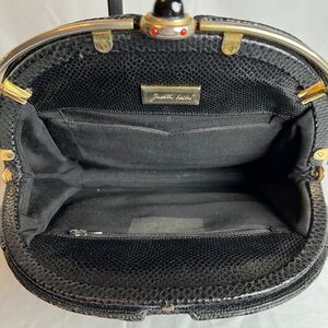 Are you looking for a statement piece to add to your vintage collection? Check out this stunning 1980s Lizard Skin Clutch with a detachable strap! Its gold-toned metal frame with an onyx hinge clasp adds a touch of elegance, while its grosgrain lining and two inner pockets (one zippered) provide practicality. The interior Judith Lieber brass plaque is a testament to its quality craftsmanship. And with a drop of 19-1/2", you can rock this clutch easily. Plus, it ships with its original dust bag! Remember, this vintage beauty does show some wear all over, adding to its character and charm. Don't miss out on this unique piece!