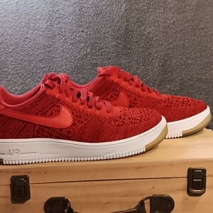 Men's Nike Air Force 1 Low Flyknit Sneakers, Excellent Condition, Color Red, Lace-Up Closure, Size 7, #817419-600, Original Insoles, No Heel, Toe, or Tread Wear, I ship all orders in 24 hours or less using USPS. After receiving shoes if condition is not acceptable instead of leaving low ratings or negative comment just message me to return shoes and I will give a full refund on ur purchase.