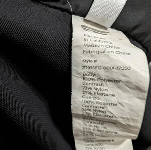 Features: black nylon jacket, ultra soft fleece lined, zip up front, long sleeves with ruched detailing, hooded, ribbed hems