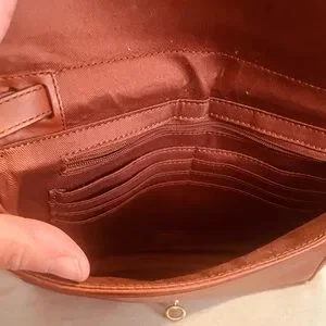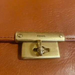Beautiful Fossil leather wristlet with gold hardware turn knob closure, 3 pockets, 8 credit card slots and wristlet handle. Can be used as a clutch or wristlet. The perfect bag for your wardrobe that can be use year round.