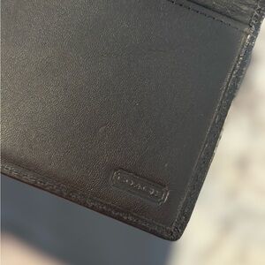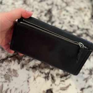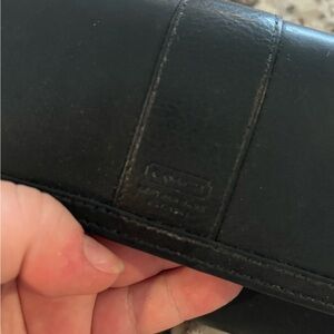 Vintage Coach Black Stitch Leather Tri Fold Wallet Removable Checkbook. Zipper on back of wallet is broken as photographed and the stitching is apart so the zipper will not zip. Beautiful wallet and can’t tell the zipper doesn’t work unless looking up close for it.