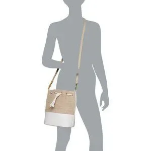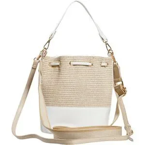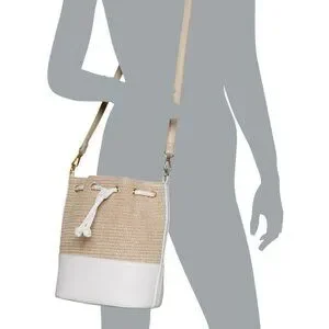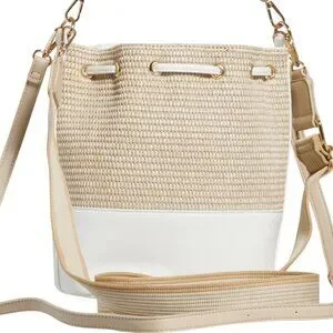 This Moda Luxe Eleganto Straw crossbody bag features a woven and faux-leather design, perfect for everyday use.