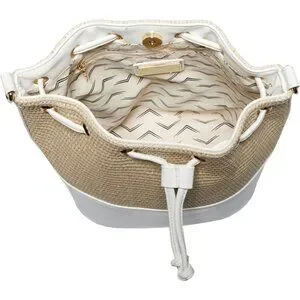 Woven polyester and cotton straw panels and polypropylene faux-leather bottom.