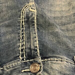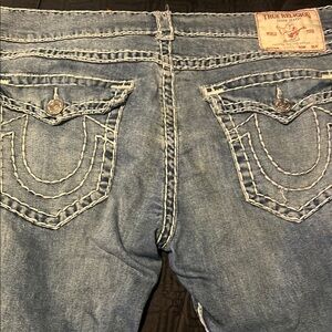 Stylish True Religion jeans. Features signature stitching. Classic blue denim color.