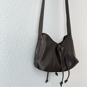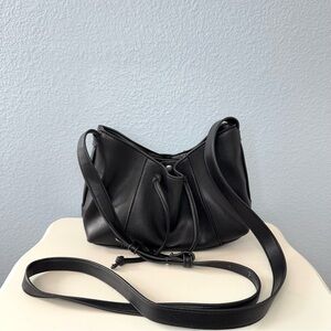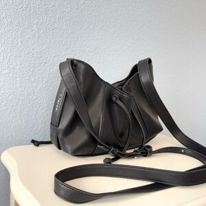 DETAILS black, long strap, adjustable knots on outside, single inside pocket