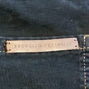 The Low Slung Jean. Fine ribbed corduroy. Excellent condition. Made in Italy. Very dark navy/black color.