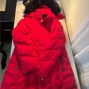 This vibrant red puffer jacket features a distinctive quilted design with puffy padded sections, providing both style and warmth. The smooth and shiny surface is typical of water-resistant winter coat materials, making it a practical choice for cold weather. The raised collar adds an extra layer of comfort and protection against the elements.