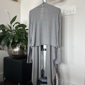 Open asymmetrical wrap-sweater styling is shorter in the back and longer in the front