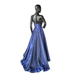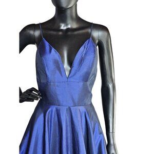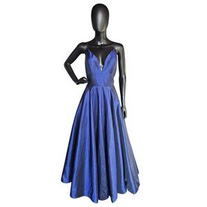 Elevate your evening with the Sherri Hill Iridescent Blue Formal Dress. This a-line silhouette features a plunging v-neck and spaghetti straps for a sultry and sophisticated look. The fitted bodice and flared skirt with a horsehair hemline provide the perfect billowing effect, while the hidden pockets add functionality. The exquisite iridescent royal navy blue taffeta and the hint of a sweeping train make this gown a showstopper. Perfect for prom or any formal event.