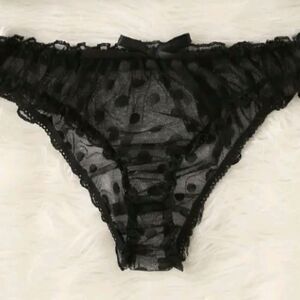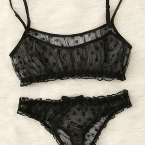 ■ Crafted from sheer material, both the bralette and matching panties showcase an all-over polka dot pattern.