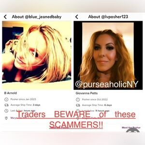 Everyone please be aware of jay_phoenix, this is her 6 or 7 acct now if not more and she is back trading. She will do several people right to get some good trade reviews under her belt then she will start not shipping and ghosting. Trade at your own risk! Lvposher123 has a new account under pursesholicny and she and blue_jeanedbaby have scammed a few friends of mine and I wanted to get the word out there to warn other traders about them!! Blue_jeanedbaby got my friend for $2K with of merchandise! Lvposher123 has given excuse after excuse on why she hasn’t shipped, or said she did ship and gave out phoney tracking numbers to two different people. lvposher HAS A NEW ACCOUNT UNDER POSHAHOLICNY AND SHE HAS SCAMMED YET ANOTHER ONE OF MY friends, PLEASE BE CAUTIOUS if asked to trade with these poshers! I wouldn’t do it if I were you! Please share and warn your friends! Trade with these losers at your own risk! ⚠️@greeneyes501 is also a scammer! She opened a case on a dress she bought then returned it to the seller with actual throw up all over it!! Who does that?! She opens false cases and damages the goods!! Scammer alert! *mklover1136 is another scammer that has now scammed at least 3 people by sending some stuff (not as described) then as soon as she gets her box, she says she shipped another box and never actually shipped. She then starts selling/trading those new items and ghosts/blocks! She’s a liar and a thief! She also has another account! See all pics; added her merc too