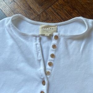Flattering white henley with elbow short sleeves and deep button placket. Organic cotton, round neckline, classic but casual. Only worn once and gently washed, no stains or flaws.