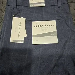 Brand New and very stylish contemporary dress pants by Perry Ellis. Slim fit, flat front pants. windowpane pattern is very subtle but classy. Unused and comes from a smoke free home.