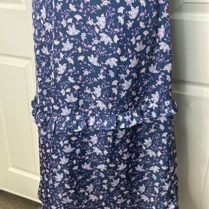 In good used condition. Floral pattern. Puff sleeves. V-neck. Side zipper. Ruffle detailing. Asymmetrical hem.