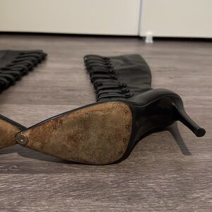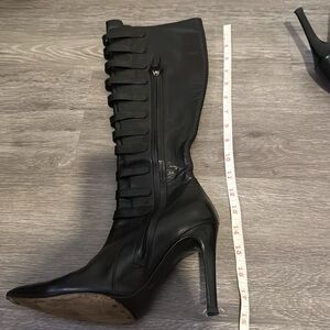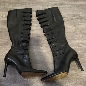 These are so sick! Hard to find Calvin Klein leather button up boot. Leather is extremely soft (I would guess lamb, but there’s no marking). Approx 4in heels, approx 10.5in sole as best I can measure which seems to be a US size 6.5 (see a video for a comparison to another 6.5/7 size boot). I would recommend this for narrow width feet, they are tiny. Really great condition, some scuffs and wear on soles. Previous owner had taps put on the tip for protection. Side zip, buttons are decorative. If these fit you, I’m jealous!