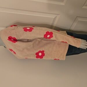 Tahari women's flower print sweater size medium. Magenta flowers with tan background and faux button back. Like new condition.