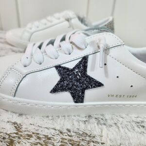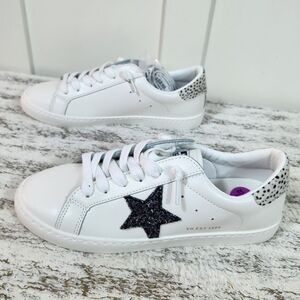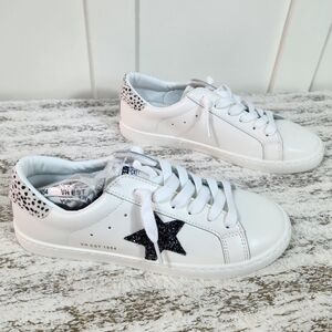 fashion sneaker features a no tie closure and leather upper. Black glitter star embellishments on side of shoe. Cheetah print fur heels. Pair with a dress or shorts."