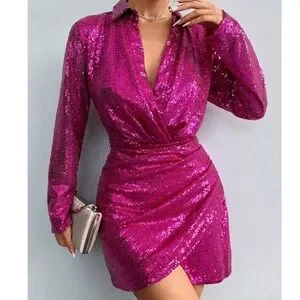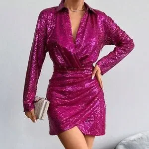 Luxe Hot Pink Sequin Long Sleeve High Waisted Ruched Party Evening Dress