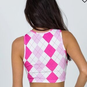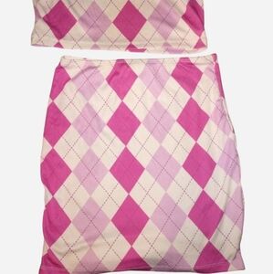 Princess Polly 2 Piece Pink Argyle Lalette Crop Top and Matching Mini skirt. Baby Pink, Hot Pink, and White combo argyle graphic printed top & skirt. Sleeveless. Racerback. Bodycon. High waist. Ribbed Stretch. In great condition. Comes from a pet-free, smoke-free home. Sold out online.