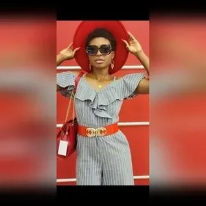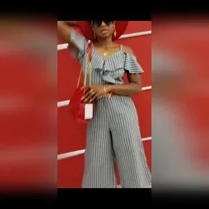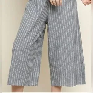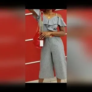 Features a white pinstripes on gray, adjustable shoulder straps, ruffle sleeves, wide legs, cropped ankle length, and front pockets.