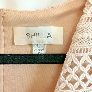 This beautiful dress from Shilla features a pale pink crochet like fabric in a pale pink color. Zippered back. Fully lined.
