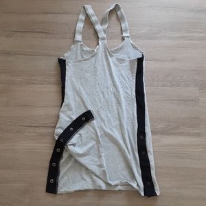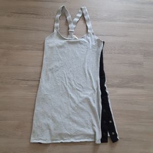 Comfortable light heather grey bodycon dress with black color blocking down the sides. Functional snaps allow for a more customizable flare at the hips. Elastic Halter neckline with a racerback. Straps are a little wavy, but not as noticable when worn.