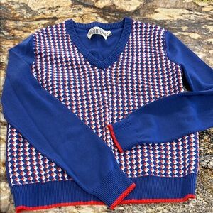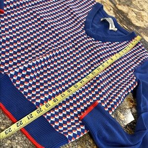Stay stylish and comfortable with this blue and red patterned men's sweater. Perfect for any casual outing.