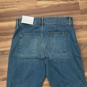 A modern classic slim flare high waist, fitted through hip s d thigh, belt looos, front zipper with button closure can be worn dress or casual.