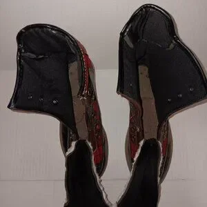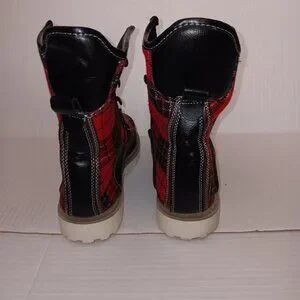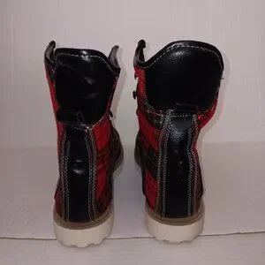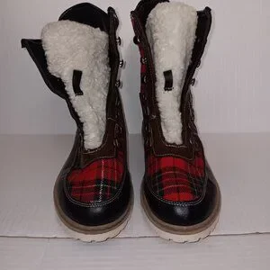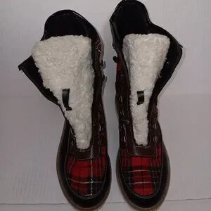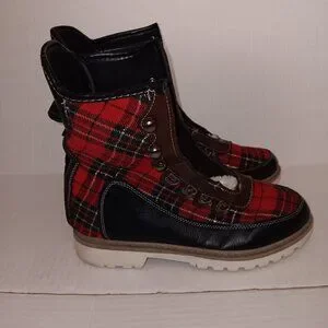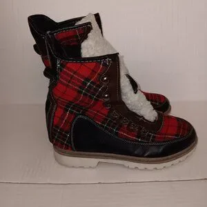 Size 9 Women's - HOTKISS Black color boots with Multi color Red and Green plaid print boots with FAUX FUR Note No boot laces and No inner Soles as seen in photos in pre-owned condition