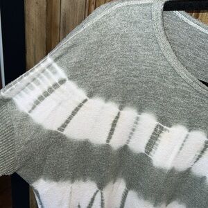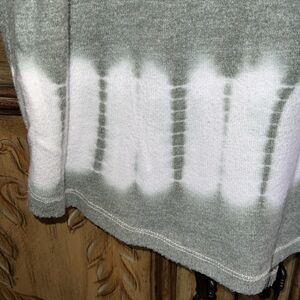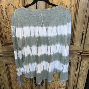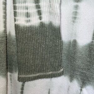 Green tie dye two piece pajama jogger set. Top has round neckline, waffle knit on arms and round hem. Joggers have front pockets with rib knit waist and cuffs. Tie closure at waist. Shirt bust measures approximately 27 inches and length is approximately 26 inches. Joggers measure approximately 16 inches at waist and approximately 38 inches long with 30 inch inseam. Size large