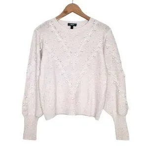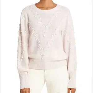 Super soft and delicate pullover cashmere sweater with cableknit and bobble details, size medium. Crewneck, rib knit trim, heathered pale pink with grey color. Lightweight, semi- sheer, great transitional sweater. Regular fit, not oversized, please see measurements.