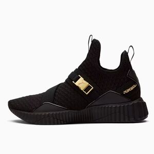 Puma Black shoes w/gold hardware. Women’s Defy Mid-Top training shoe.