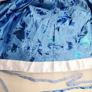 This children's Alice in Wonderland dress from the Disney Store features an enchanting design inspired by the classic tale. It includes a vibrant blue skirt adorned with metallic character illustrations, a white apron, and a charming Alice pendant. Designed with puff sleeves and layered tulle, it offers both style and comfort for young wearers.