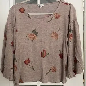 Lucky Brand women’s cropped bell sleeve floral top. Has a slight gold sparkle undertone throughout the shirt. EUC!! I only wore this shirt once and didn’t like the way it fit me. I believe it was NWOTs when I bought so it’s barely been worn. Size medium fits true to size. Definitely cropped would look great with jeans/jean skirt and boots.