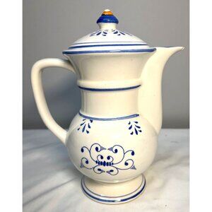 This vintage ceramic coffee pot features a charming blue and white floral design, perfect for enhancing the aesthetic of any kitchen or dining space. Its elegant shape and nostalgic appeal make it a delightful addition for those who appreciate classic kitchenware.
