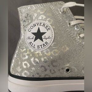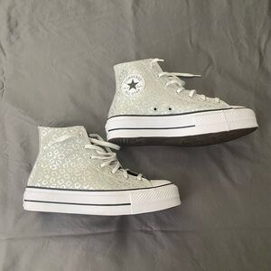 Converse All Star Chuck Taylor. Glitter Leopard Spot, Platform Sneakers. Converse signature round rubber cap toe. Canvas detail on tongue and heel. Unisex sneaker, Women’s Size 9 or Men’s Size 7 1/2. Shoes are like new! Add them to your wardrobe today!!