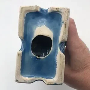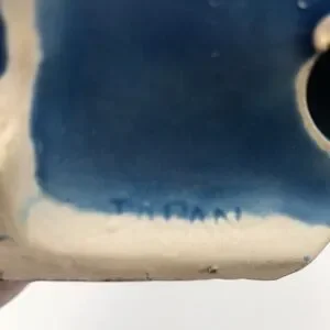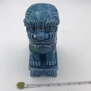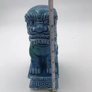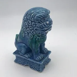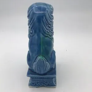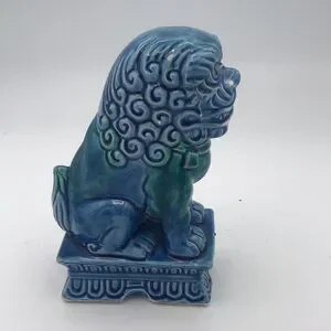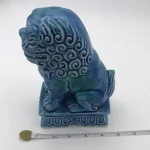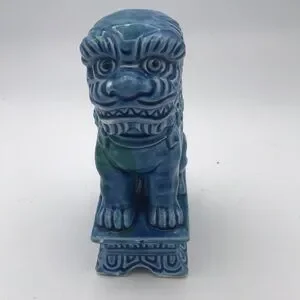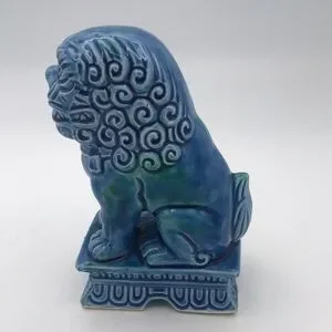 Vintage Mid 20th Century…Foo Dog…Glazed Porcelain…Turquoise Color…Made in Japan (JAPAN stamped on bottom)…Measures approx 7-1/4” tall x 3” wide x 5” deep…Very good preowned vintage condition (see pics - some paint chips which are normal with age but no cracks or repairs)