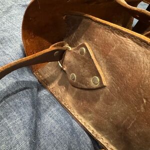 This rugged vintage-style leather briefcase features a rich dark brown color and a large main compartment. It includes a sturdy leather handle for easy carrying and a long adjustable shoulder strap for versatile wear. The flap-over top is secured with buckle closures, adding to its classic appeal.look at the photos shows wear..needs some tlc