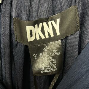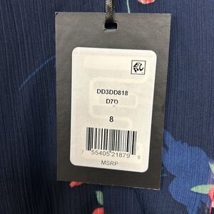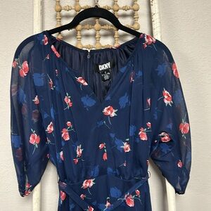 Navy DKNY flower print dress. New with tags. Donna Karen New York. Size 8. Pink and red flower print. Sheer dolman half sleeves. Matching tie belt. Fit and flare style with the belt. Knee length. Fully lined. There’s a small snag near the v neck.